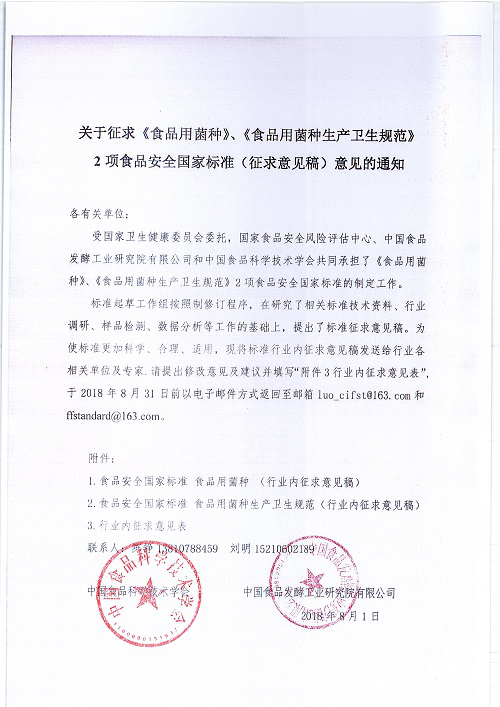 关于征求《食品用菌种》、《食品用菌种生产卫生规范》 2项食品安全国家标准(征求意见稿)意见的通知